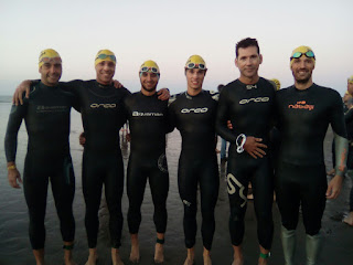 La natación, y con el objetivo principal que tengo, es la gran olvidada. Aún así voy sacando unos 3 entrenos a la semana. El sábado 6 disputé la I Travesia a nado de Mazagón. Agua muy fría, y mucho nivel en cuanto a los nadadores. Hice la prueba de 3000 m., pudiendo rendir a buen nivel hasta los últimos 400 metros donde me quedé bloqueado muscularmente. Ritmo cercano a lo que quiero en el IRONMAN, aunque mejorable. Puesto 25º de la general, a 1:28 el 100. Satisfecho por poder mantener un buen ritmo de nado hasta casi el final. Se que puedo hacer un parcial aceptable ahí sin que me suponga un gran desgaste en cuanto al entreno, pero tampoco puedo despistarme...
